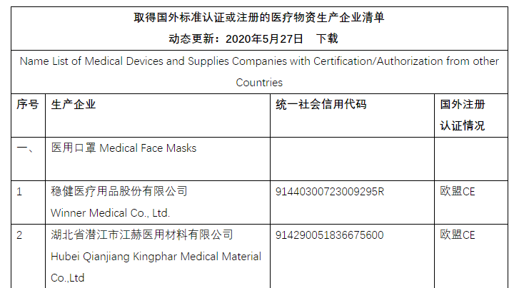 5月27日,取得國外標準認證或注冊的醫療物資生產企業清單繼續更新,其中,醫用口罩清單新增63家企業,醫用防護服清單新增7家企業,紅外體溫計清單新增4家企業。 &nbs...